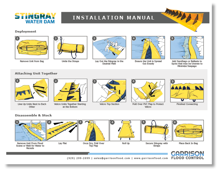 The Stingray™ Self-Deploying Water Dam is made from flexible PVC material allowing it to conform to nearly any surface, as well as be deployed on varying sub-surfaces within the same area.